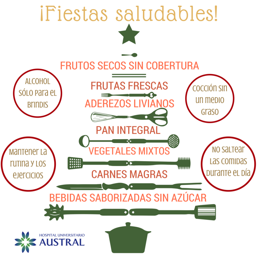 La Licenciada Virginia Asti junto con el equipo de Soporte Nutricional del Hospital Universitario Austral, elaboraron un decálogo de consejos para no caer en excesos durante las fiestas. Además, describieron un “menú tipo” con diferentes opciones.